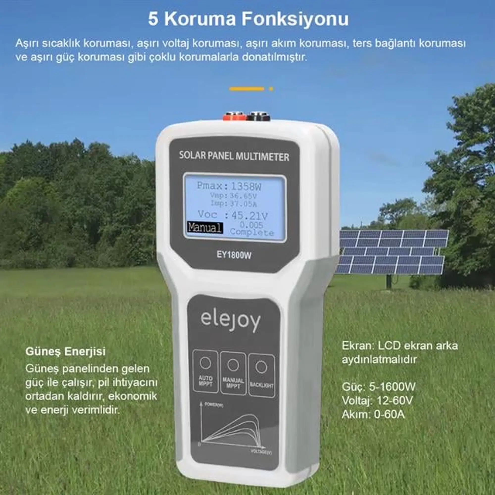 PowerMaster PM-26940 Fotovoltaik MPPT Solar Panel Voltaj Multimetre, güneş panellerinin performansını ölçmek ve izlemek için geliştirilmiş profesyonel bir cihazdır. 1800W'a kadar güç ölçümü yapabilme kapasitesi, 12-60V voltaj aralığı ve 0-60A akım ölçümü ile kapsamlı bir ölçüm çözümü sunar. LCD ekranı ve arka ışık fonksiyonu ile kullanımı kolaydır. Otomatik ve manuel ölçüm modları ile farklı kullanım senaryolarına uyum sağlar. Solar panel ile çalışır, batarya gerektirmez.